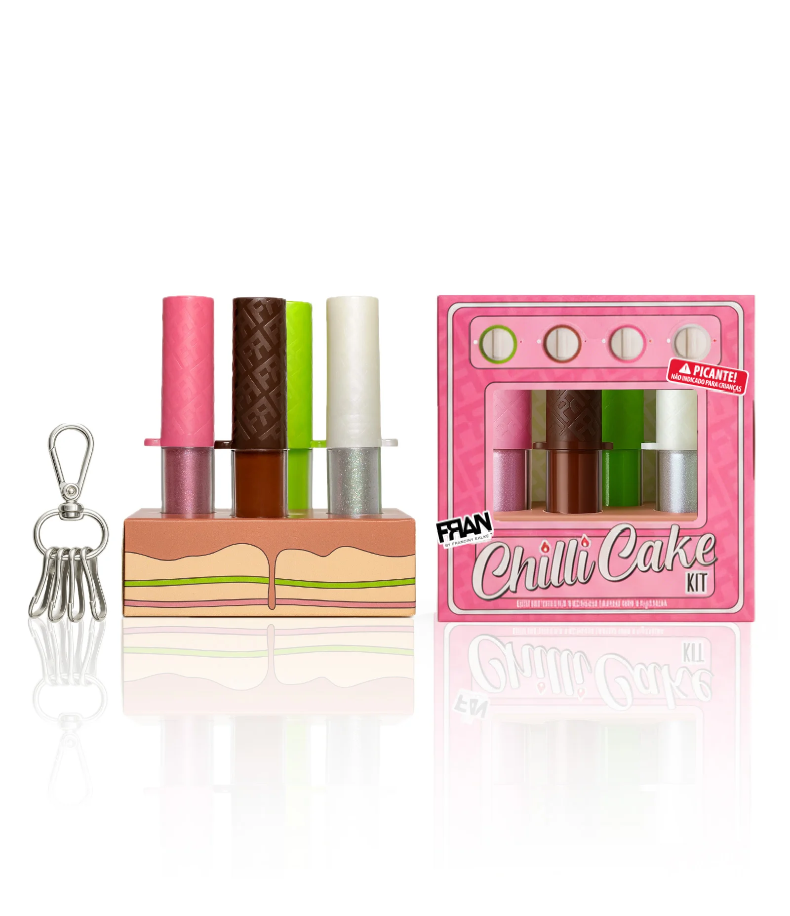 Esses quatro glosses vêm dentro de um bolinho super fofo, o Chilli Cake, que é recheado com brilho, estilo e uma surpresa especial: cada gloss tem um furinho para você pendurar a correntinha exclusiva que acompanha o kit. Um presente pensado com carinho para você brilhar ainda mais!