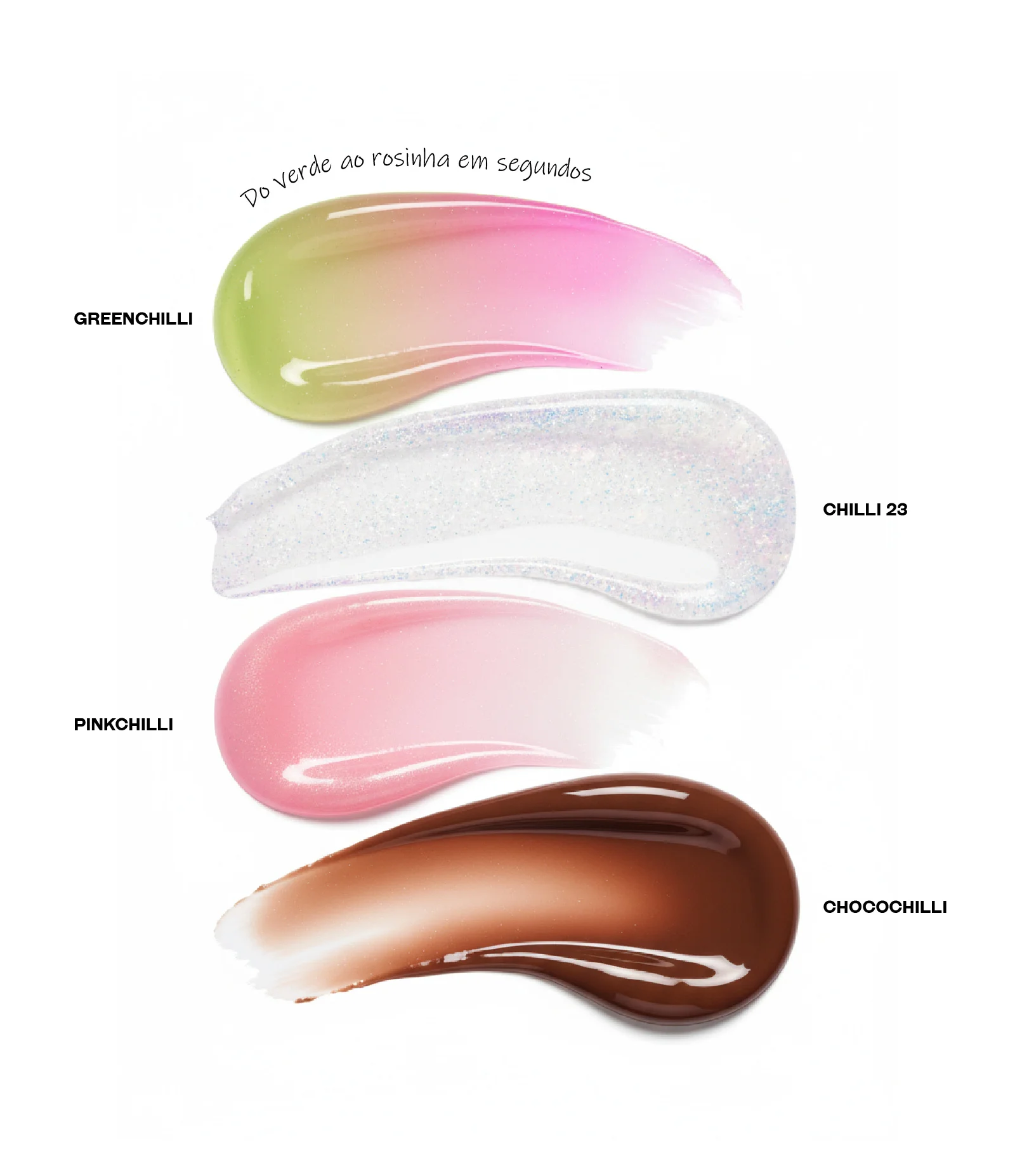 · GREENCHILLI – Lançado em março de 2024, com embalagem verde e fórmula que reage ao pH dos lábios, revelando um tom rosado único.