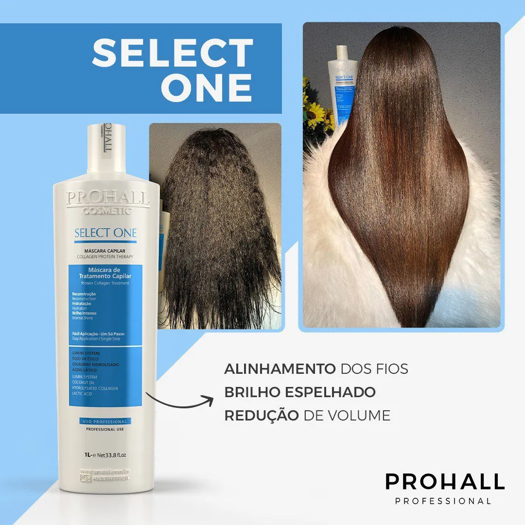 Escova Select One Prohall: Aplique o produto nos cabelos secos depositando-a em toda fibra capilar, iniciando da raiz as pontas (respeitando a distancia de 0,5 cm da raiz), deixe agir por 30 a 90 minutos, dependendo da espessura do fio. Enxágue para retirar o excesso de produto, seque 100% e divida em 4 partes. Pranchar com a temperatura de 200º C em mechas finas até a selagem da cutícula. Enxaguar e finalizar como desejado.